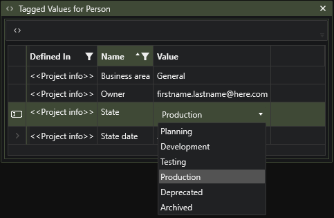 Tagged Values can be created as standalone local parameters for a model element, or they can be created by assigning a Stereotype for the element. The entire set of Tagged Values available for an element can be viewed and edited in the Tagged Values list.