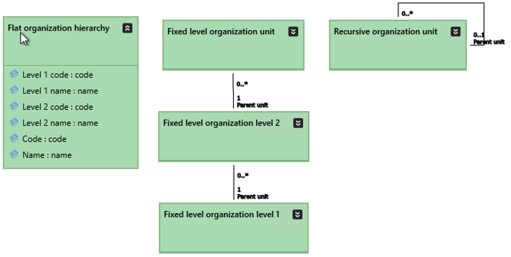 Step 2: Load hierarchical organization A flat organisation hierarchy The fixed level structure has as many hub/satellite pairs as there are levels, as well as a link table to point to the upper level.