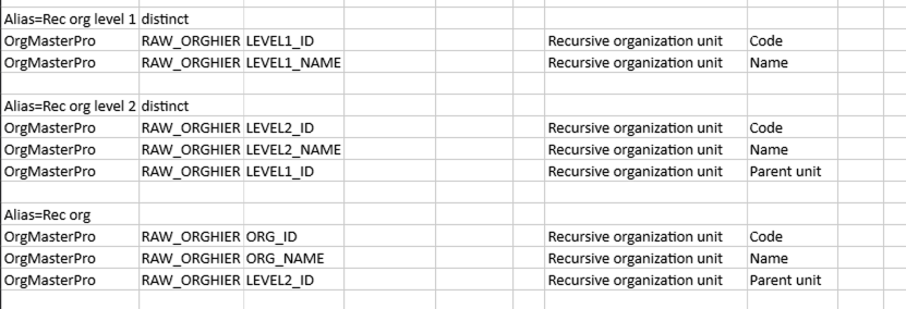 From a new source, OrgMaster Pro, we get an organization structure presented to us as a flat structure, as opposed to a self-referencing structure we loaded in Tutorial 05 of the Professional course. We load this data set into three different target structures. Using aliases, we will load the sama data to: