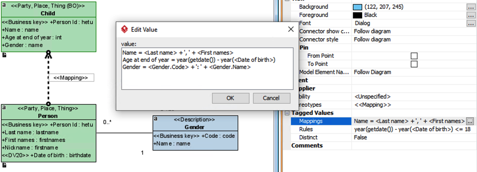The generated SQL code of Mapping is based on attribute-to-attribute mappings, which are either explicit or implicit. The explicit mappings are defined in the mapping’s Tagged Value, and the implicit mappings are based on these rules: