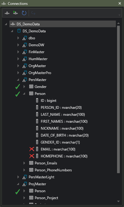 Using the newly created connection, locate the simulated source system data from the PersMaster person register and the ProjMaster Project Management software in the DS_DemoData database. For this first tutorial, only consider Person and Gender data from PersMaster and Person data from ProjMaster. Also, pretend that PersMaster’s Person data does not have the email and Home phone attributes, we will add those to the model as part of the next tutorial.