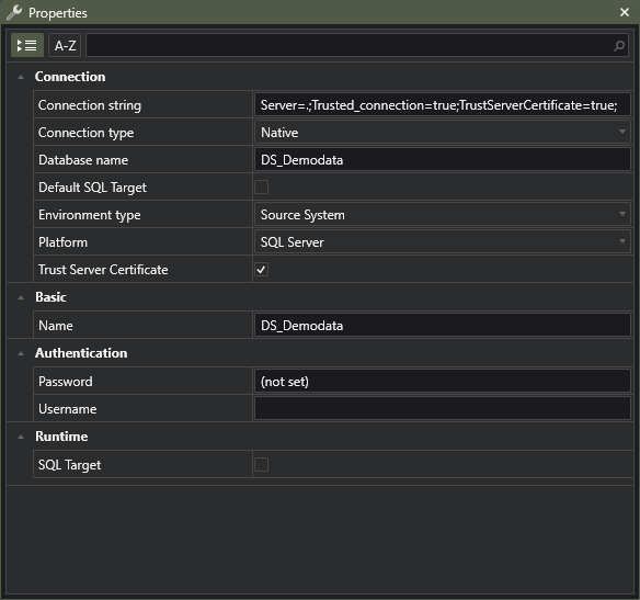 First, create a new connection in the Connections pane. Any new connection will default to a local installation of SQL Server, which we will use in this course. Set the Database name to DS_DemoData and check the Trust Server Certificate check box. This adds the text ;TrustServerCertificate=true to the end of the default connection string.