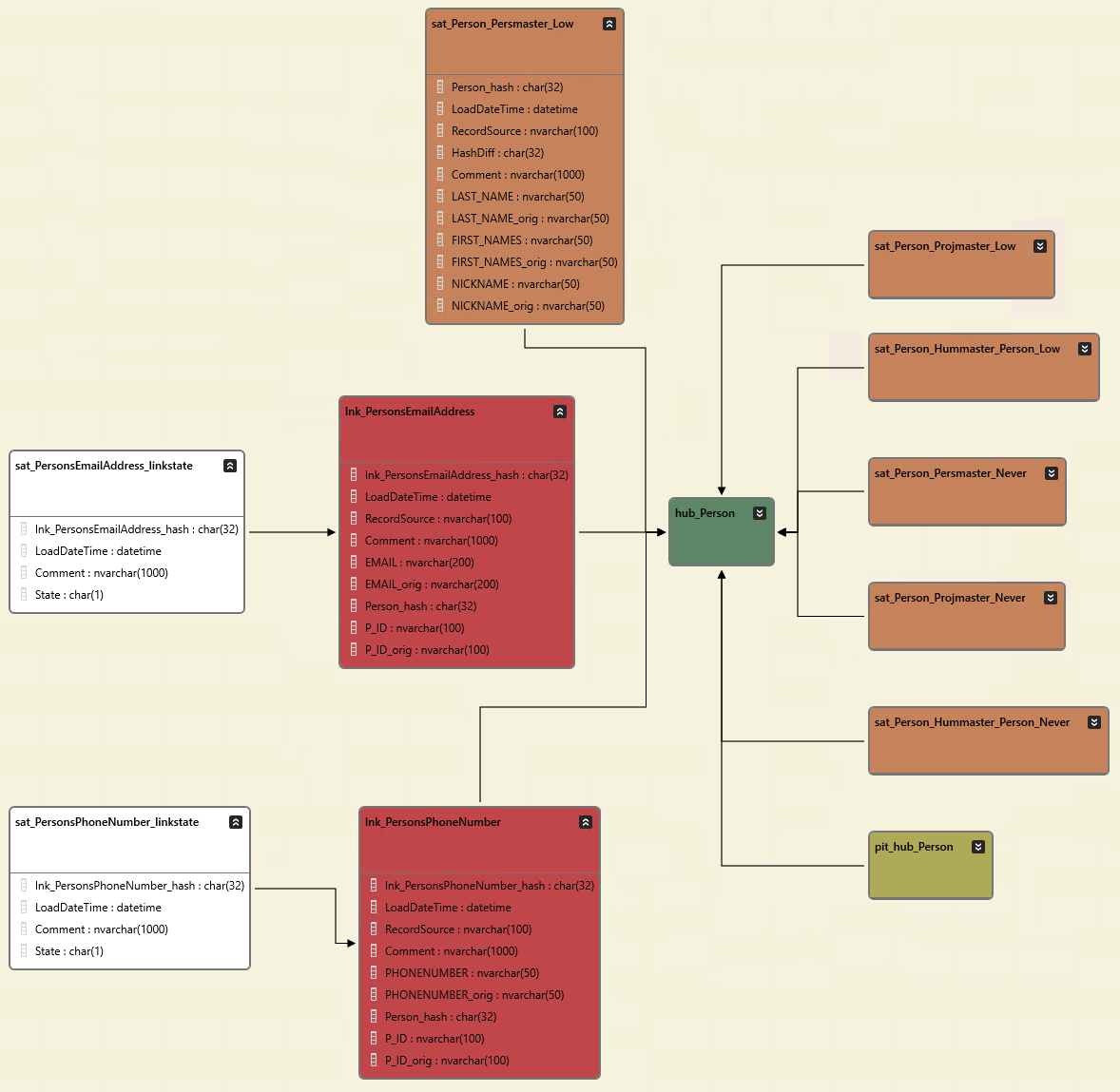 Also remove the phone number and email mappings for Person, as the structure has changed. Save the project and run the model. Your Raw Vault should look like this: